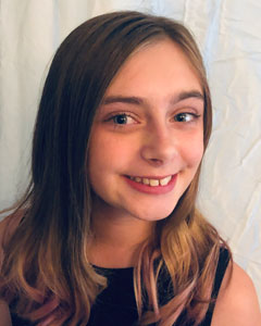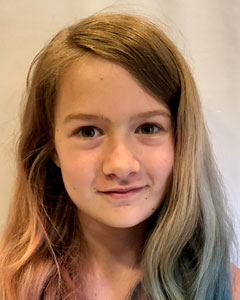 NAOMI WHITE (Dahlia) is going into 6th grade. She loves acting and has been in several school plays including “Aladdin,” “Mystery at the Museum” and “Sparkleville.” In her free time, Naomi enjoys painting, pottery, soccer, mountain biking and baking. She would like to thank Mrs. O’Rear for passing on her passion for acting, teaching her, and allowing her to audition for this play.
